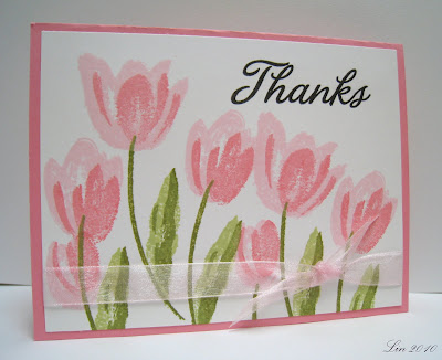 Thought I'd share this card I made yesterday. My friend Carol lent me this Stampin' Up set called Terrific Tulips (now discontinued), and I have been having so much fun playing with it. Each of the images comes in 2 parts, the background and a coordinating detail stamp. I used 2 shades of each color in Distress Inks: spun sugar and worn lipstick, and shabby shutters and peeled paint. Love the effect these stamps give! I followed a sketch Carol had included with the stamps, but I'm hoping to come up with something of my own next. The sentiment is from a Hero Arts clear set called Thank You Sayings, from Hannah.