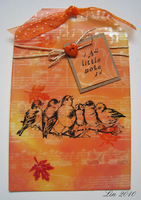 Hi, Lin! What a pretty tag! I love the warm fall tones! You got great results with the Perfect Pearls + water stamping! I love that you made a tag on a tag! Love the birds and leaves and music together, too. Thanks so much for participating in my challenge! :-)