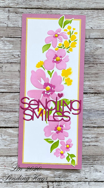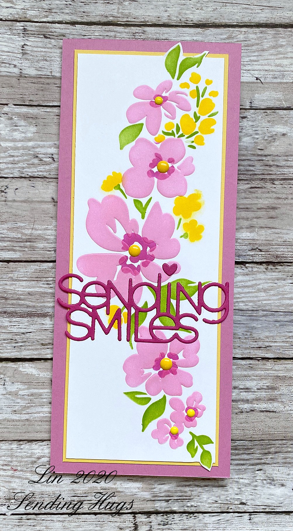supplies: white, yellow, pink, and Doll Pink cardstock, Pinkfresh Studio Floral Notes layering stencils, Altenew Baby Pink, Fushsia, Maple Yellow, and Lime inks, blending brush, Simon's Sending Smiles die, yellow enamel dots
