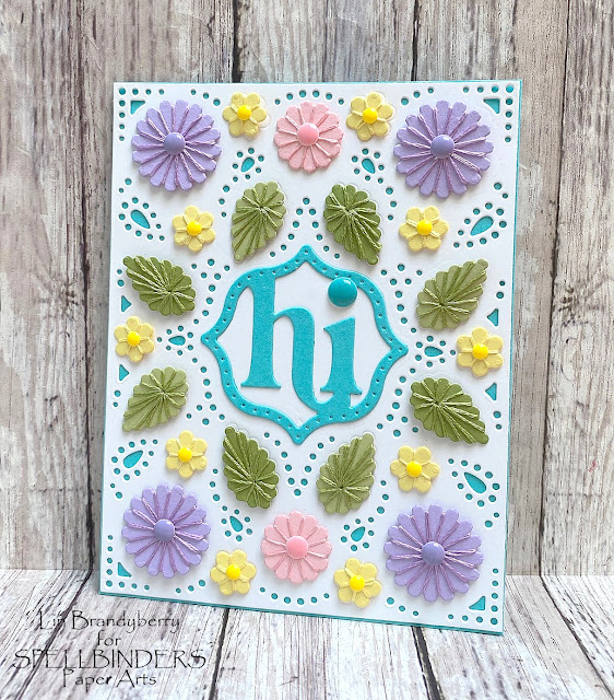 This month, the kit is more of a wrap kit than a stitching one! For each element you bring your needle up through the center, then just wrap around the flower or leaf until complete, then secure the loose ends with a glue dot at the back, which also serves to add it to the pierced panel. Then I just glued the finished panel to a dark aqua one, and added the center sentiment to finish. Then I added enamel dots to all of the flowers, and dotted the "i" for continuity. This was a fun design to work on!